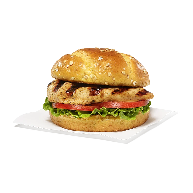 A lemon-herb marinated boneless breast of chicken, grilled for a tender and juicy backyard-smoky taste, served on a toasted multigrain, brioche bun with green leaf lettuce, and tomato. Pairs well with Honey Roasted BBQ sauce.