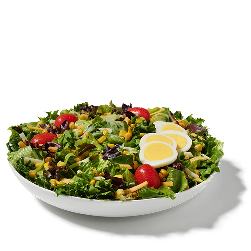 Grilled chicken filet sliced and served on a fresh bed of mixed greens, topped with grape tomatoes, shredded Colby Jack cheese, and a zesty combination of roasted corn and black beans. Prepared fresh daily. Pairs well with Creamy Salsa dressing.